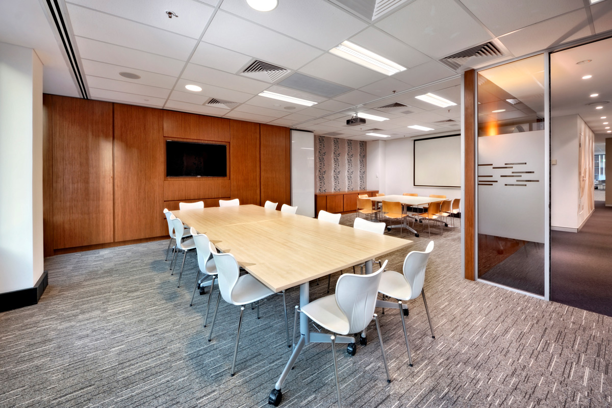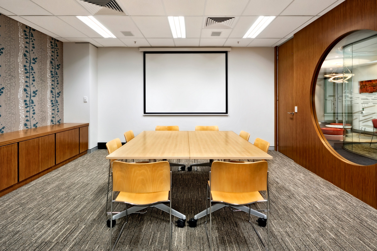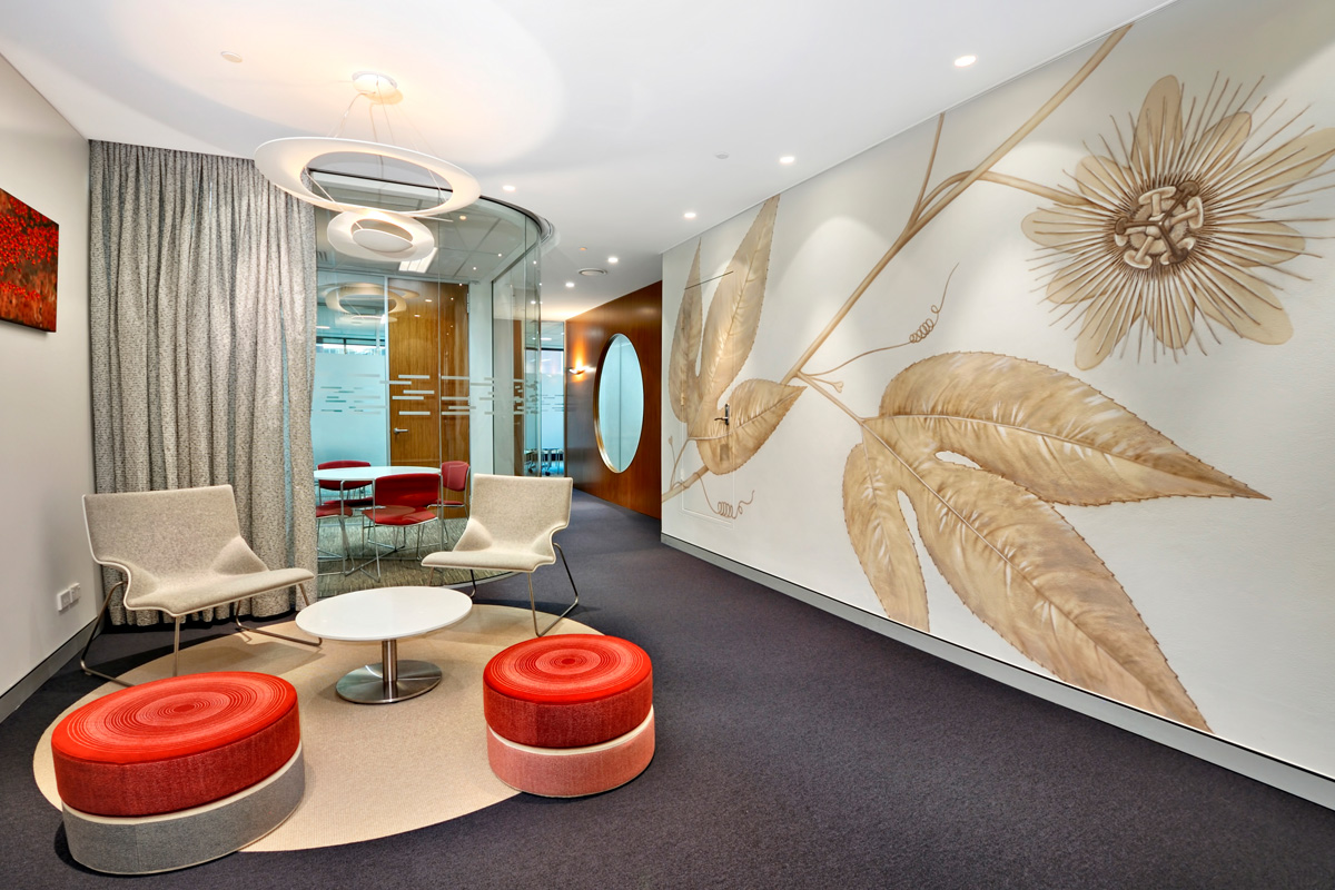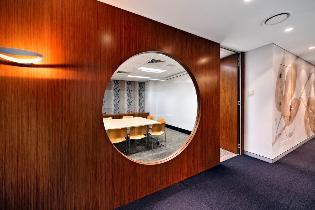 Utilising curved wood, wallpaper murals, glass, drapes and partitions, the large space was portioned into a combination of open plan spaces, private offices, team rooms, client meeting spaces, breakout rooms, reception and staff common areas.